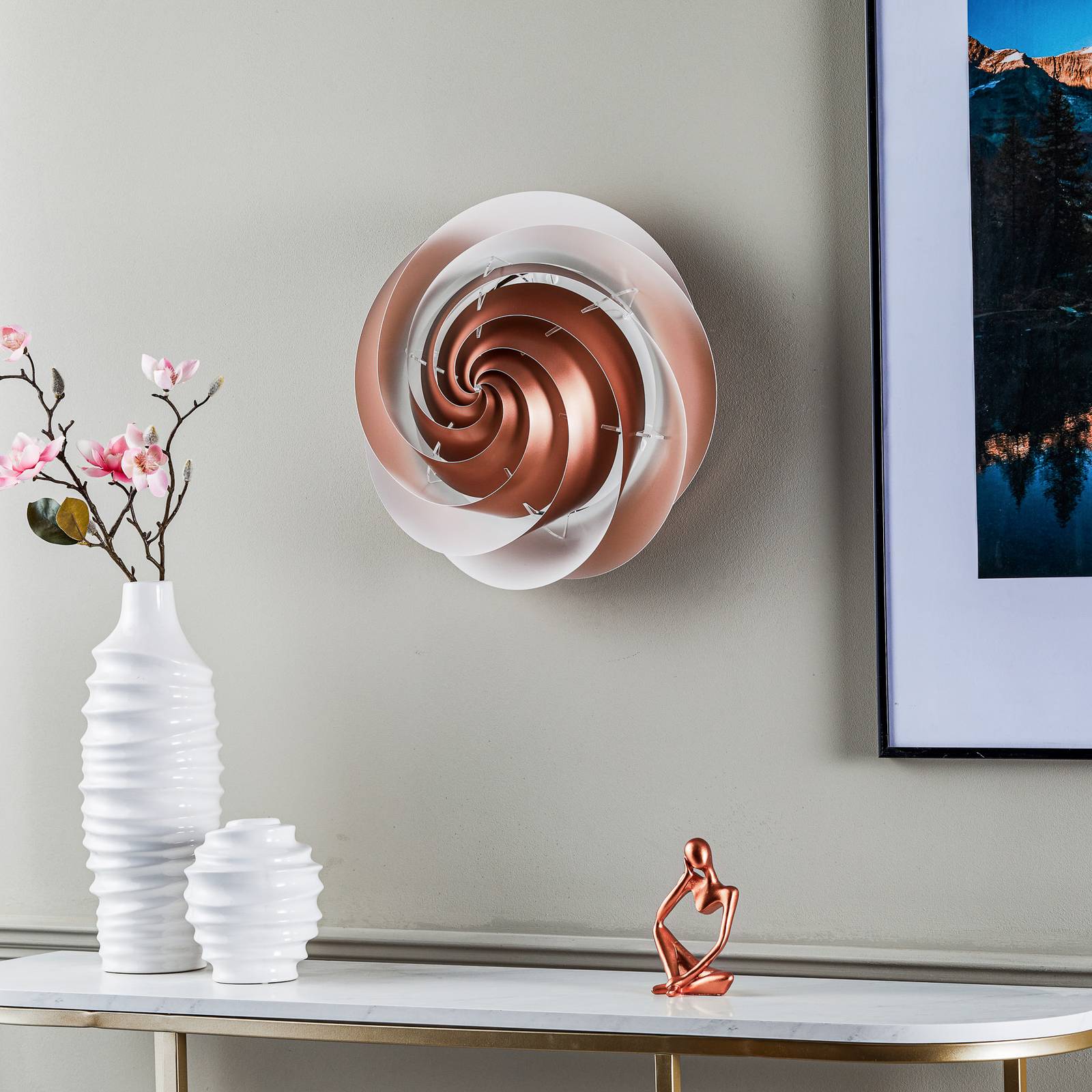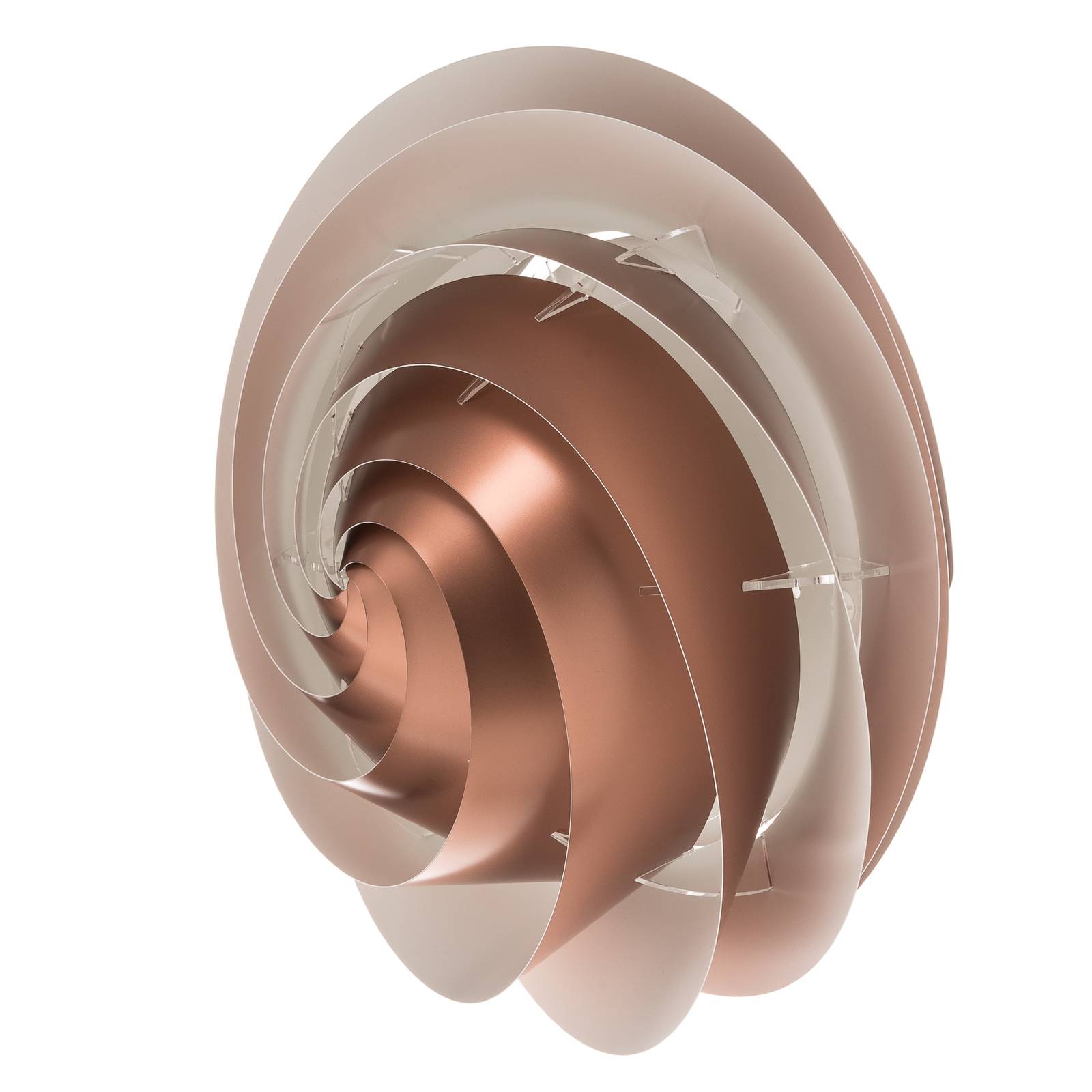 Applique Swirl - un capolavoro fatto a mano La splendida lampada Swirl rende onore al suo nome. Il paralume di Swirl è formato da elementi acrilici artisticamente ritorti che si uniscono a spirale nel centro della lampada. Gli elementi sono verniciati in color rame su un lato. La forma fa pensare a un gorgo o anche al bocciolo di una rosa. Qualunque cosa ricordi la lampada, rimane comunque un vero capolavoro che valorizza ogni ambiente con il suo fascino unico. L'applique Swirl deve essere trattata con delicatezza in quanto costruita con un materiale altamente filigranato. Da oltre 100 anni il produttore danese Le Klint realizza i suoi prodotti con un lavoro manuale molto complesso e a tutt'oggi attribuisce grande importanza alla qualità delle sue lampade. L'azienda danese è stata fondata nel 1943. Nello stesso anno ha aperto un negozio a Copenaghen che ancora oggi si trova nello stesso posto. Le Klint vanta dunque una lunga tradizione di lampade esclusive con particolarità che vengono mantenute a tutt'oggi. Ciascuna lampada è un pezzo unico in quanto finora nessuna macchina è mai stata in grado di riprodurre la specifica tecnica di piegatura a mano delle lampade. L'assortimento di Le Klint comprende sia prodotti tradizionali che risalgono a 40 anni fa sia nuove creazioni di stile moderno.