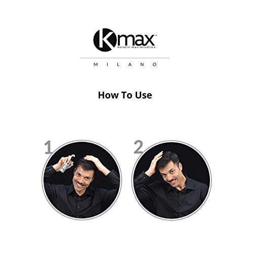 Modo d'uso: dopo aver applicato le microfibre di cheratina Kmax sui capelli, erogare il Kmax Fixing Spray da una distanza di circa 20 cm, lasciando depositare un leggero strato di prodotto;