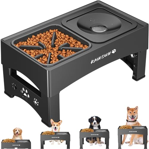 KMNSUN Ciotole Per Cani Rialzate, 3-in-1 con Alimentatore Lento e Ciotole per Acqua Anti-versamento, 4 Ciotole per Cani Rialzate Regolabili in Altezza, Impediscono al Cibo di Volare Fuori-Nero