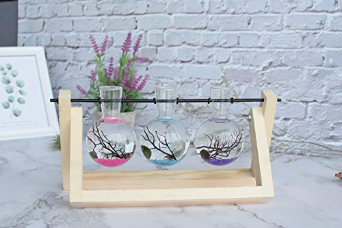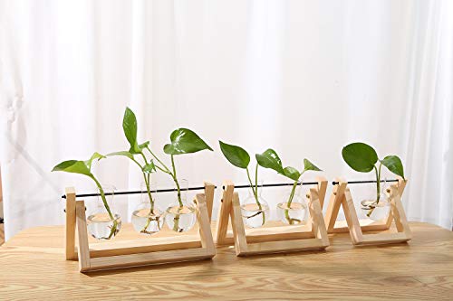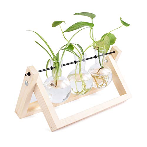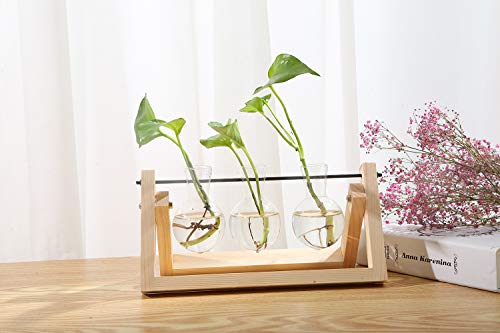 KnikGlass Vaso a bulbo color legno con supporto in legno vintage, set decorativo unico per piante idroponiche, decorazione per casa, interni ed esterni, elegante e semplice (3 vasi)