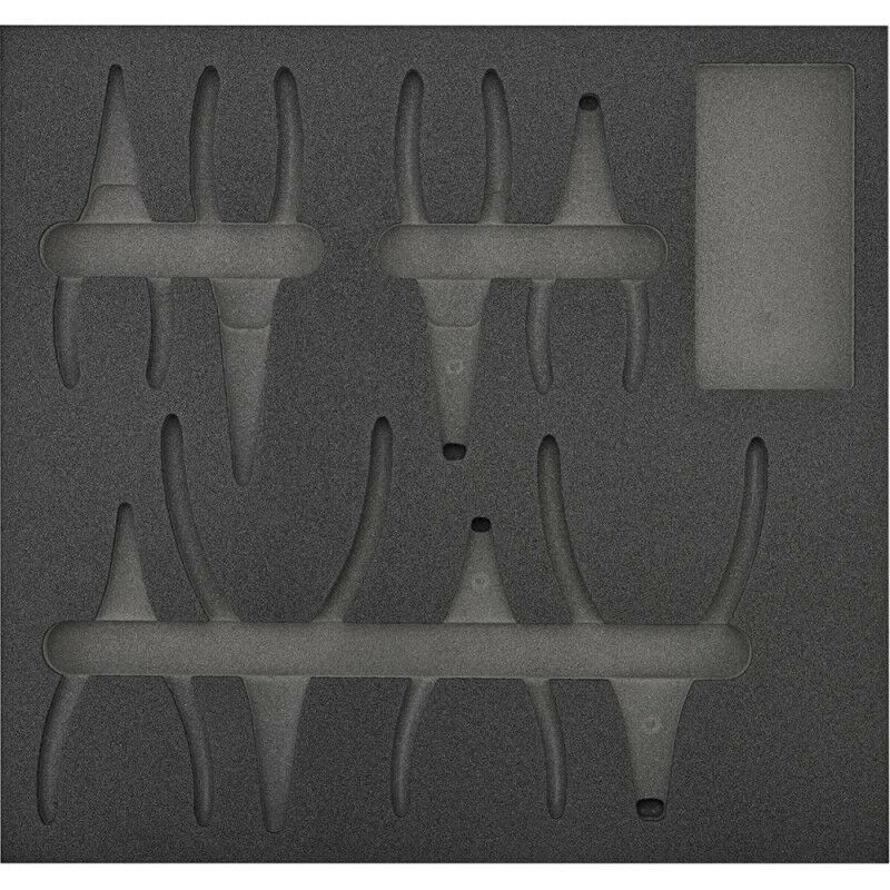 Modulo utensili pinze per anelli di sicurezza. vuoto - Inserto in schiuma a 2 colori. per identificare a colpo d'occhio gli utensili mancanti Per contenere: 2 pinze per anelli di sicurezza. dritte. J 1. J 2 2 pinze per anelli interni. angolate a 90°. J 11. J 21 2 pinze per anelli esterni. dritte. A 1. A 2 2 pinze per anelli esterni. angolate a 90°. A 11. A 21
