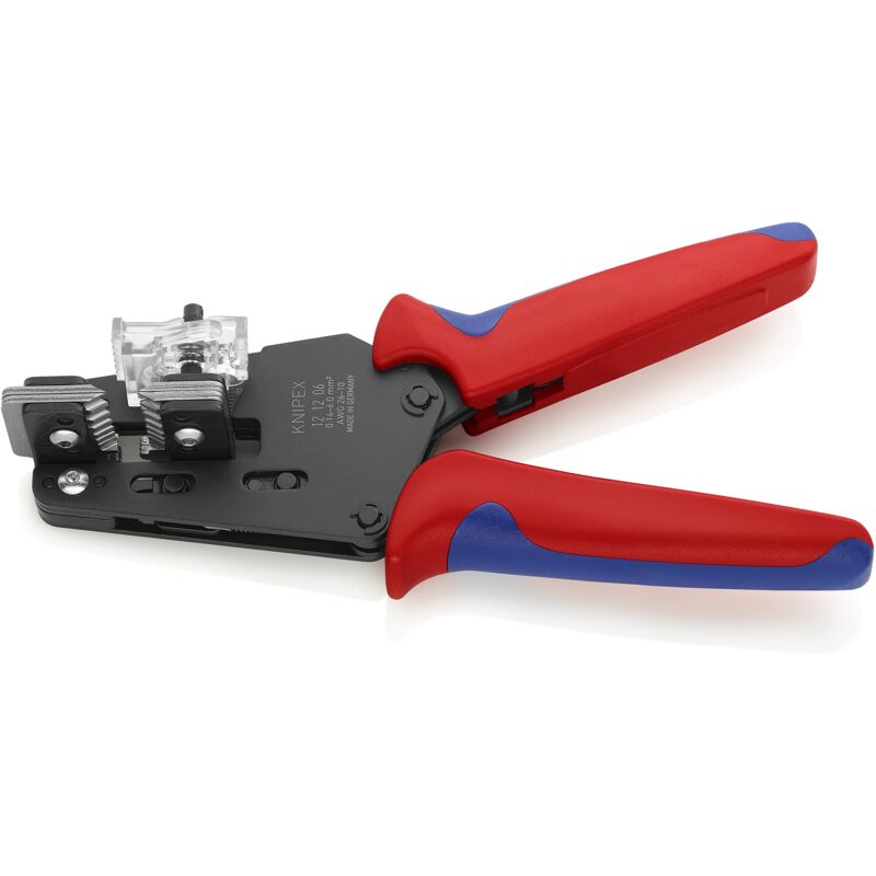 Pinza spelacavi di precisione per rimuovere con alta precisione geometrica le guaine isolanti anche a più strati in PTFE, silicone, Radox, Kapton e gomma di difficile rimozione. Una seconda coppia di lame trattiene indietro l'isolante rimanente in modo affidabile Lame sagomate intercambiabili adattate in modo esatto alla sezione del cavo Con battuta di arresto per garantire lunghezze uniformi nel caso di lavori in serie Corpo della pinza in acciaio, lama in acciaio speciale per utensili temperata ad olio Spelatura ad accoppiamento geometrico anche di materiali isolanti di difficile rimozione in PTFE, silicone, Radox, Kapton e gomma anche a più strati Una seconda coppia di lame mantiene fermo l'isolante residuo Lame sagomate intercambiabili specificamente adattate alla sezione del cavo Con staffa di arresto per garantire lunghezze uniformi nei lavori in serie Corpo pinza: acciaio Corpo pinza: alluminio. Lama: acciaio speciale per utensili, temperato ad olio. Pinza brunita, impugnature