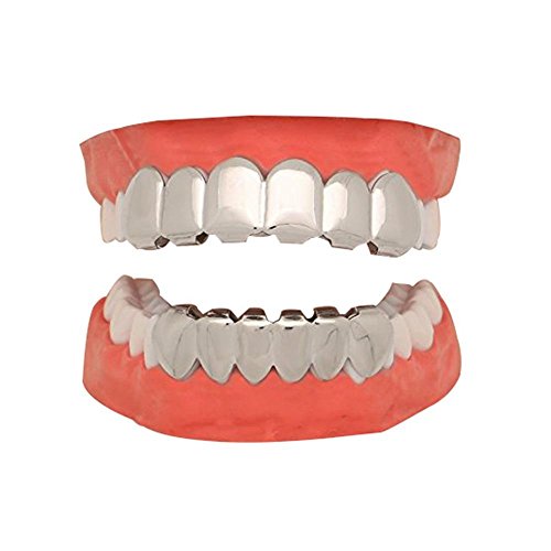 Kobwa, Paradenti placcato oro per arcata superiore e inferiore, denti hip-hop, paradenti per bocca, set superiore e inferiore Perfetto per foto, musica, video e da indossare tutti i giorni. Silver1