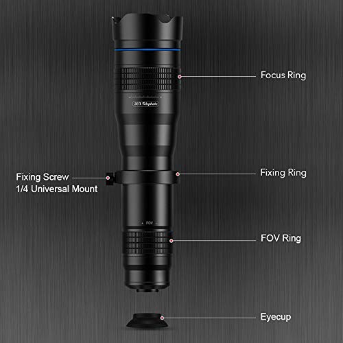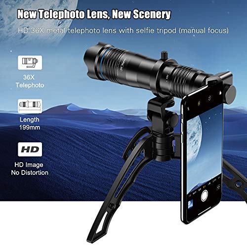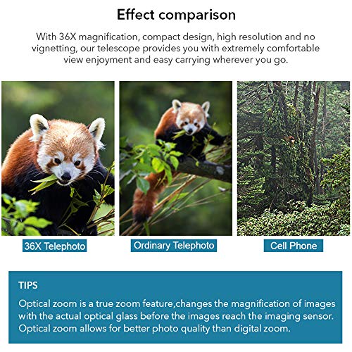 36X Telephoto Phone Lens: With 36X magnification, high resolution and no vignetting, our telescope provides you with extremely comfortable view enjoyment. It is adjustable for the objective, not only easily adjust the focus of the lens by rotating the focus ring to bring those long distance scenes into clear images without any dark, it also can work as a monocular telescope.