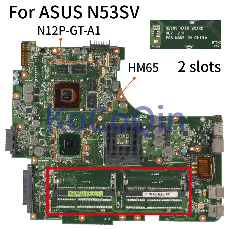 KoCoQin Laptop motherboard For ASUS N53SV Mainboard REV.2.HM65 N12P-GT-A1 DDR3 2 slots