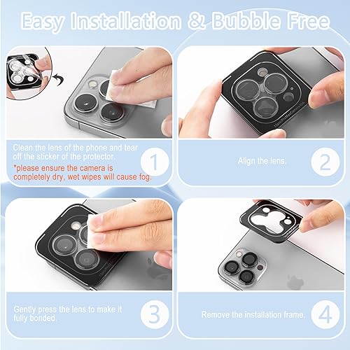 5. [Facile da Installare] Basta pulire l'obiettivo della fotocamera e rimuovere la polvere o lo sporco, rimuovi la pellicola inferiore del protettore, allineala sull'area della telecamera e la delicatamente pressione per far aderire il protettore. ⚠ Attenzione!! Non applicare la protezione dell'obiettivo della fotocamera subito dopo aver pulito l'obiettivo con poiché ciò potrebbe causare l'appannamento della pellicola dell'obiettivo della fotocamera poiché l'alcol non evapora completamente.