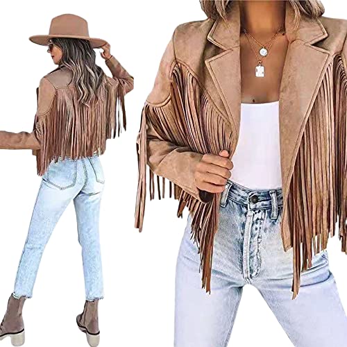 Koitniecer Giacca in pelle con frange da donna Giacca in nappa scamosciata sintetica Cardigan corto vintage Moto Biker Cappotto corto Outwear (Coffee, Medium)