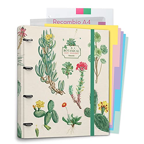 Kokonote: Raccoglitore Organizer Botanical Cacti | Raccoglitore ad anelli A4 con fogli e divisori, con chiusura elastica, include block di 100 fogli A4, separatori pagine e cartella portadocumenti