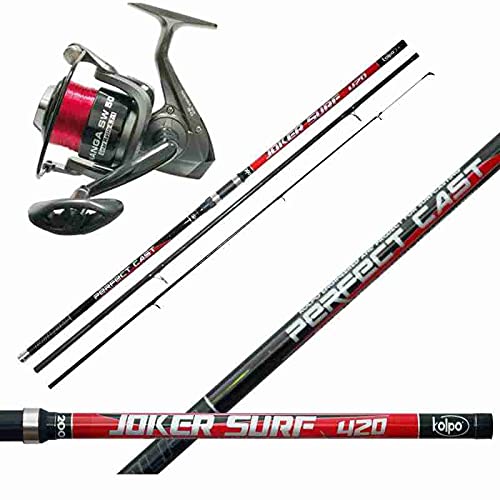 Agc Kolpo Kit Pesca Surfcasting 3 Sezioni Carbonio, Canna Kolpo Joker 420 - Azione 200 Gr - 3 sezioni Vetta Tubolare Ibrida + Mulinello da Pesca Nanga SW 5000