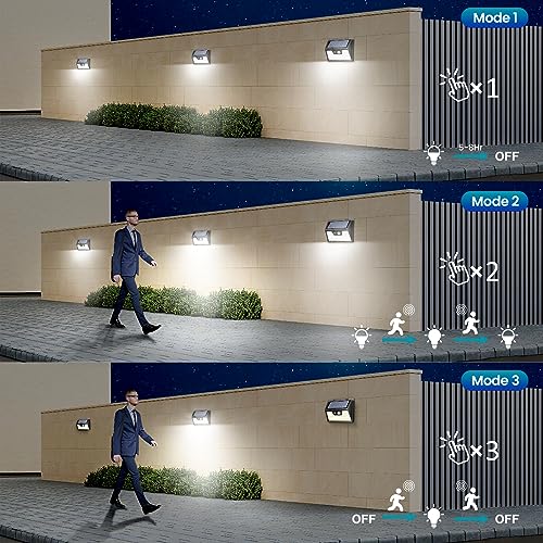 【3 Modalità di intelligente】Queste luci solari esterno progettate con 3 modalità di lavoro: ①Modalità luminosità media, l'alimentazione si accende automaticamente di notte e si spegne automaticamente durante il giorno. ② Modalità sensore luce scura, luce scura quando non in movimento, piena luminosità quando viene rilevato un movimento. ③ Modalità luce di induzione, la luce è spenta quando non in movimento, la luce è accesa quando viene rilevato lo spostamento (Consigliato da usare)