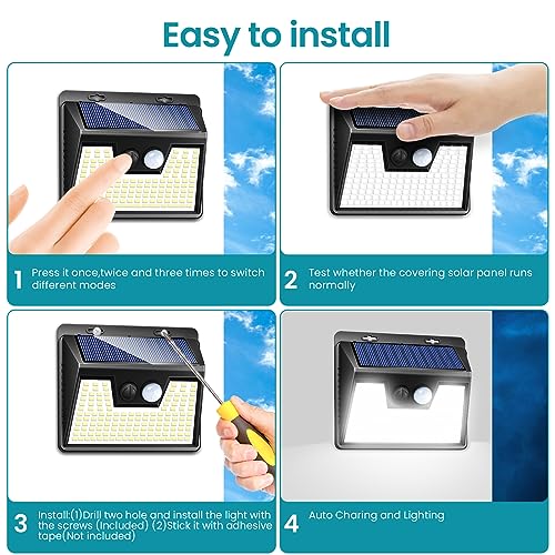 【IP65 Impermeabile & facile da installare】Faretto led da esterno solare fatto di materiale ABS ad alta resistenza agli urti, il design impermeabile IP65. Semplicemente la lampade solari a led da esterno con le viti in dotazione o nastro adesivo (non incluso) alla parete, non sono necessari cavi o fili. Perfetto per esterni come patio, giardino, balconi, terrazze. Altezza di installazione ottimale consigliata:2-4M