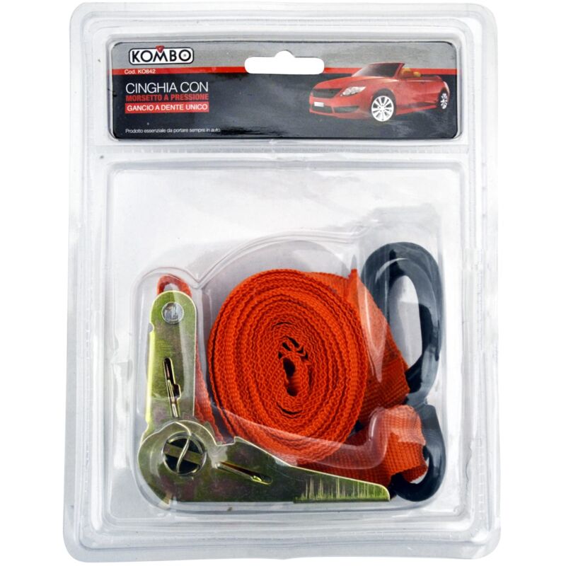 CINGHIA POLIESTERE CON MORSETTO A PRESSIONE E GANCIO A DENTE UNICO, 4.5 M x 25mm, CARICO MASSIMO 50 KG, 1 PEZZO