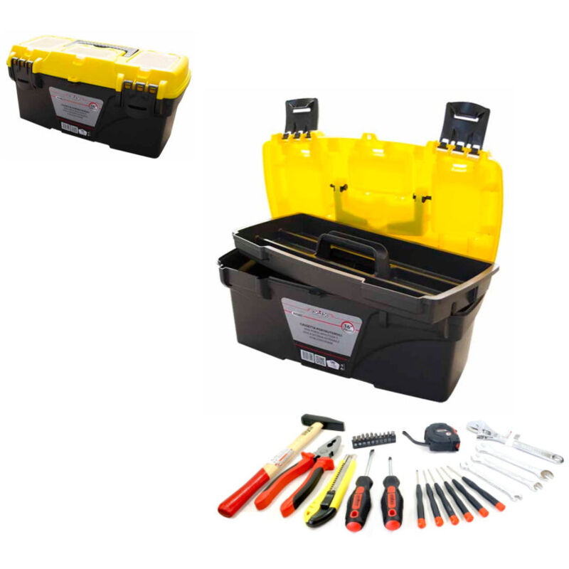IlKit Valigetta 27 pezzi rappresenta una soluzione compatta a tutte le tue esigenze di fai-da-te. La pratica valigetta KO281 custodisce al sicuro tutti i tuoi attrezzi, tenendoli in ordine e pronti all'uso. Al suo interno troverai una selezione degli utensili più flessibili per ogni tipo di lavoro! Il Kit Valigetta 27 pezzi è composto da: 1 x Valigetta Rigida portautensili KOMBO KO281 da 16" (41 x 21 x 20 cm) in Copolimero di Polietilene, colore giallo-nero, maniglia a scomparsa, 3 vani porta minuteria, vaschetta interna estraible, struttura resistente1 x Flessometro da 3 mt 1 x Pinza Universale Professionale da 160 mm 1 x Chiave a Rullino 150 mm 4 x Cacciaviti di precisione 1 x Cacciavite CR-V PH2X100 1 x Cacciavite CR-V SL6X100 1 x Cacciavite portabits 10 x Bit Magnetiche 1 x Martello Tedesco da 200 gr 1 x Cutter1 x Nastro Isolante 3mt 3 x Chiavi Spaccate in CR-V 10/11 + 12/13 + 14/15