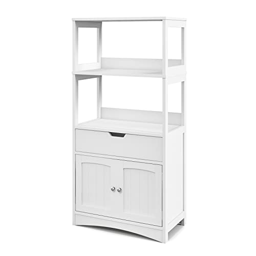 KOMFOTTEU Mobile portaoggetti con ripiano a 3 livelli, armadio alto in legno, dispositivo antiribaltamento, cassetto e armadio a 2 ante, armadio moderno, 60 x 32,5 x 122 cm (bianco)