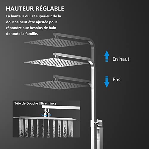 KOMIRO Colonna doccia termostatica, soffione doccia in acciaio inox, 25 x 25 cm, altezza regolabile set doccia per bagno, miscelatore doccia, quadrato