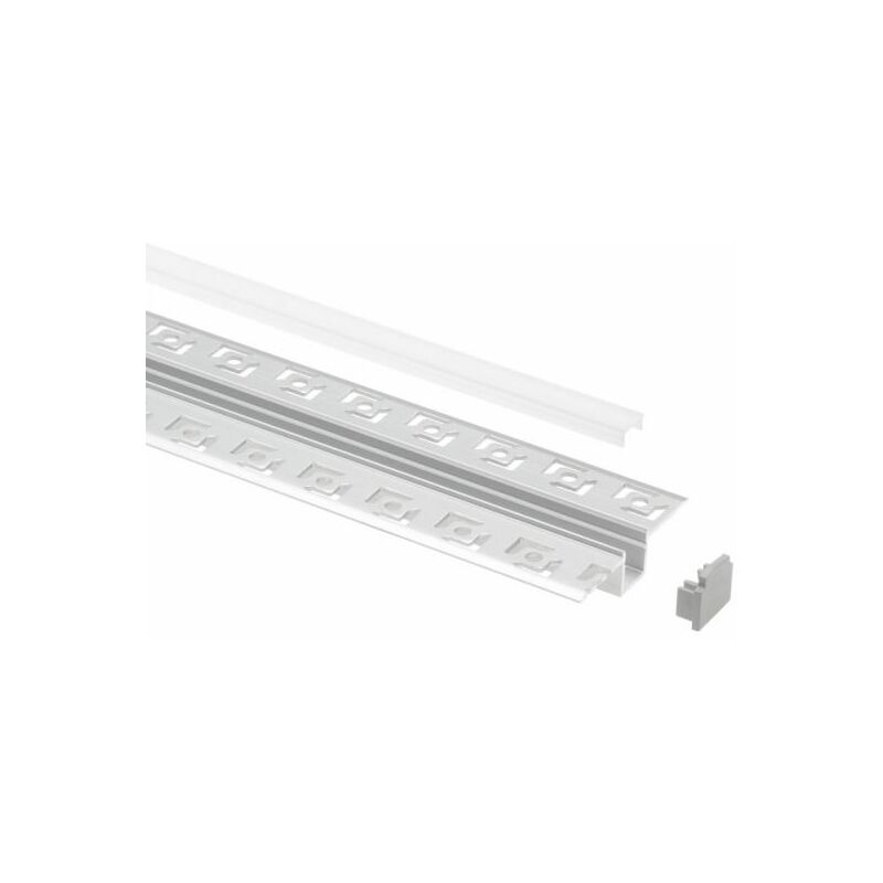 Set per montaggio ad incasso a raso su cartongesso, può alloggiare strip LED IP20 o IP65 (verificare misure ed ingombri effettivi). SET COMPOSTO DA: - Profilo medio a U in alluminio estruso anodizzato da 2m - Diffusore opale - 2 tappi