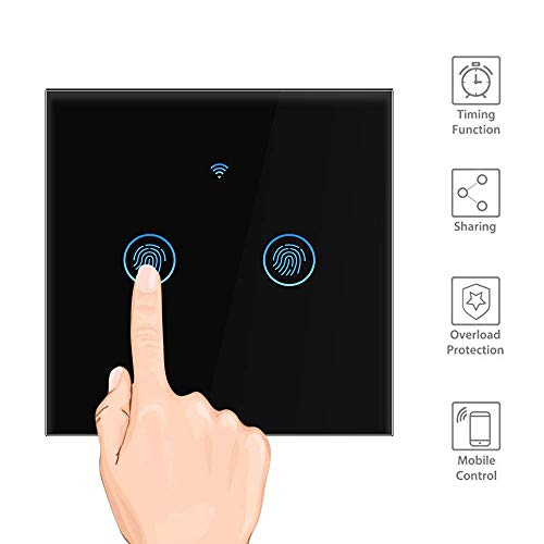 Konesky WiFi Smart Touch Switch Compatibile con Alexa e Google Home, 2-Gang Wireless Touch Panel Timer Interruttore della Luce a Parete Telecomando Smart Phone (Cavo Neutro Richiesto), Nero