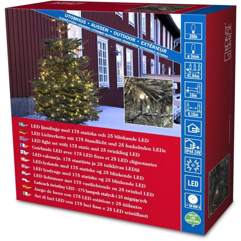 Catena luminosa a micro LED, con effetto scintille Range di uso: interni ed esterni, classe di protezione IP44 connettore di alimentazione: trasformatore 24 V numero di luci: 200 diodi cavo colore: Nero Materiale: plastica distanza: 16 cm lunghezza illuminata: 31,84 m cavo di alimentazione: 10 m