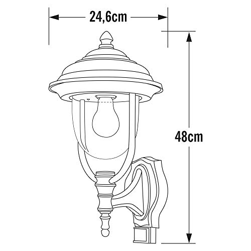 Il design tradizionale di Konstsmide, lampada da parete per esterni, perfetta per l'uso in casa, giardino o terrazza, per fornire illuminazione verso l'alto e verso il basso. Gamma PIR 5m, 140 gradi, tempo di funzionamento 5 secondi a 8 minuti