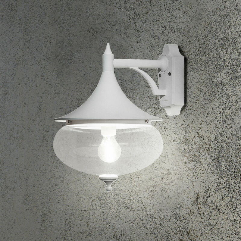 Konstsmide Libra Cupola classica per esterno bianco opaco Down Wall, IP23 | Finitura: bianco | Materiale: alluminio | Grado di protezione IP: IP23 | Altezza: 39,5 cm | Larghezza: 28 cm | Profondità: 36 cm | Tipo di lampada: E27 | Lampadina inclusa: no