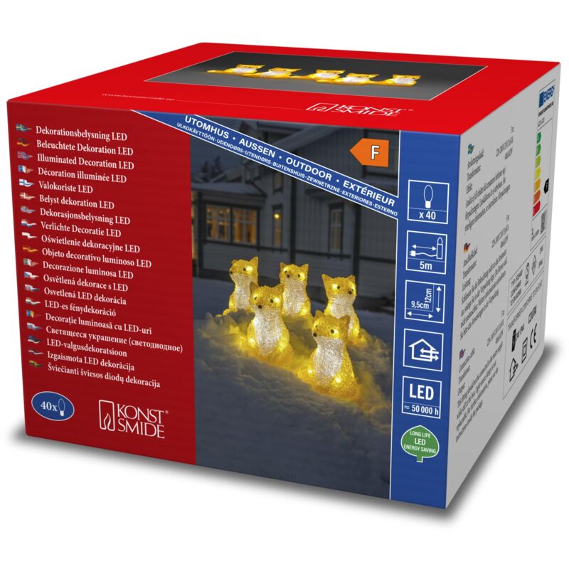 Godetevi gli ammiratori Aahhs e Oohhs. Con la struttura luminosa dettagliata di Konstsmide trasformerete la vostra decorazione da giardino in un magico paese delle meraviglie invernali. Questi volpi in acrilico di alta qualità in set da 5 pezzi emettono tanto fascino quanto una luce di effetto ed è una vera attrazione per voi, i vostri ospiti e tutti i passanti. Molte varianti di design incoraggiano a diventare creativi. Forse lasciate che la vostra decorazione invernale raccontare anche una piccola storia? Con questa statuetta luminosa della ditta Konstsmide optate per un prodotto di qualità durevole, che voi e i vostri cari potrete godere a lungo. Konstsmide da oltre 40 anni è specializzata nella produzione di decorazioni luminose di alta qualità per interni ed esterni e dal 1999 produce un impatto determinante per soluzioni LED ecologiche, durevoli e sicure.