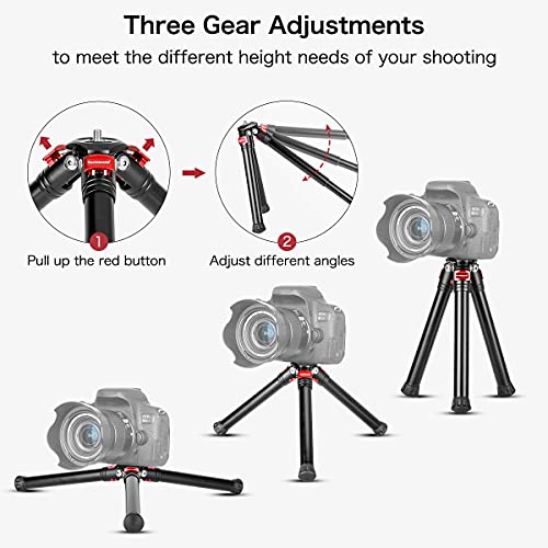 Supporto base solida: i piedini in gomma impediscono al mini treppiede di scivolare e proteggere le superfici delicate, stabilizzano il treppiede su terreni morbidi. Il mini treppiede può essere raddoppiato come una presa palmare ed è progettato per fornire una solida base di supporto per l'uso con DSLR, fotocamere mirrorless o adattatore per treppiede per telefono/GoPro.