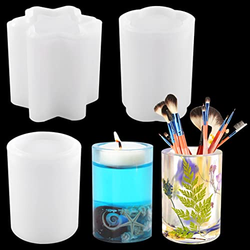 Koonafy 3Pcs Stampo per Resina Portapenne Stampi per Candele in Silicone Stampo in Silicone di Stoccaggio per DIY Gioielleria Contenitore Penna Candeliere Cosmetici Porta(Stella, Cerchio e Fiori)