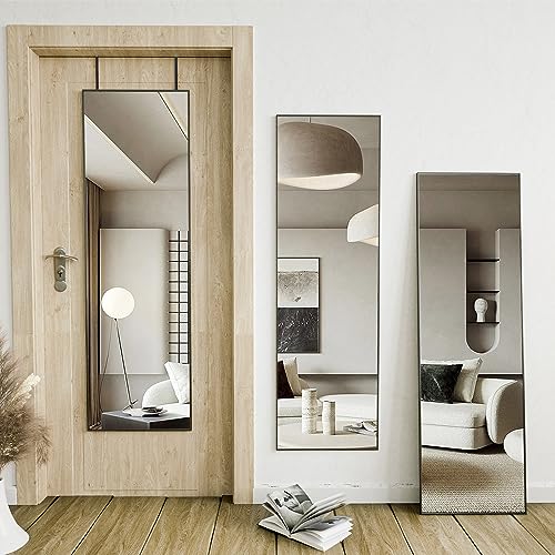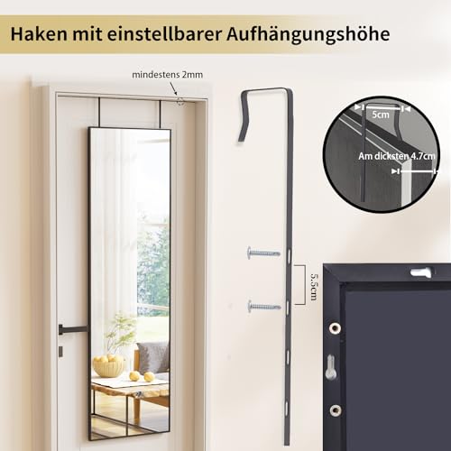 Koonmi Specchio per porta, 41 x 127 cm, specchio da parete con 2 ganci regolabili in altezza sopra la porta, specchio sospeso con cornice in alluminio per ingressi e camera da letto, nero