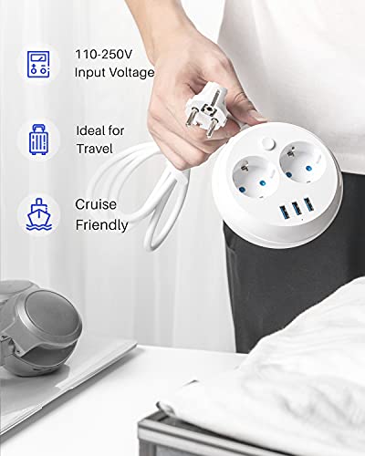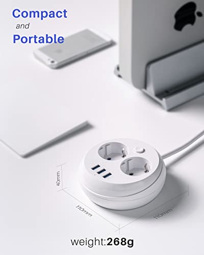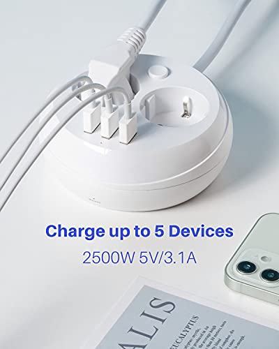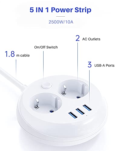 KOOSLA Multipresa rotonda (2500W/10A), Ciabatta multipresa con 2 prese e 3 slot USB-A con interruttore separato, ideale per il tavolo dell'ufficio da viaggio, 1,8M, bianco