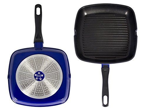 Kopf Damiano - Set di 3 padelle in Alluminio pressofuso Leggero con Rivestimento Antiaderente in Teflon, con bistecchiera, per Piani Cottura a induzione, Colore: Blu