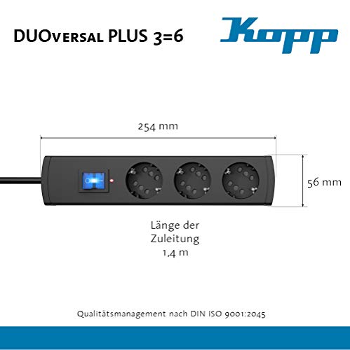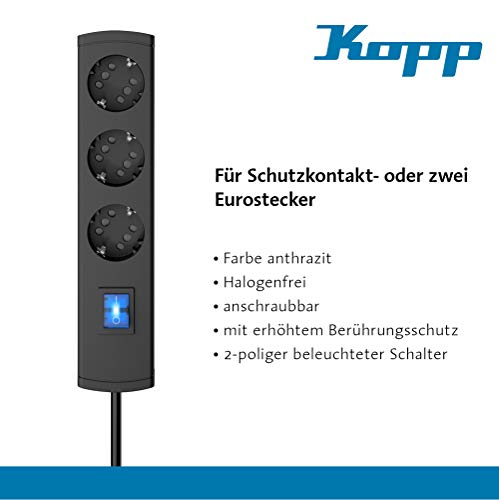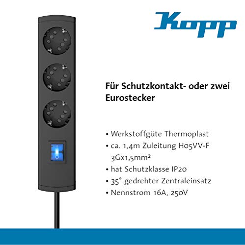 Kopp DUOversal plus 233805009 - Ciabatta multipla a 3 prese, 250 V, 3600 W/16 A, con interruttore e contatto di protezione, colore: Nero