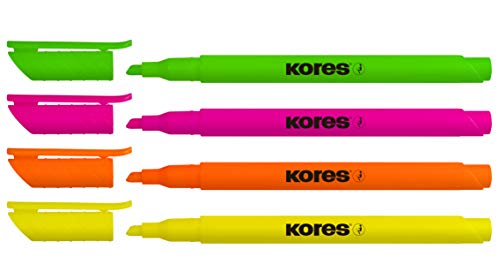 Kores - High Liner Fine: Evidenziatori a Penna Neon, Punta Fina a Scalpello con Inchiostro a Base d'Acqua, Ideali per la Scuola e per l'Ufficio, Set da 4 Colori Neon Assortiti