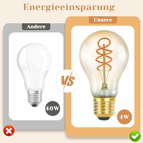 【Risparmio energetico e protezione dell'ambiente】: Si tratta di una lampadina vintage a led e27 a risparmio energetico che sostituisce la tradizionale lampadina a incandescenza da 40W. con una vita media di 20.000 ore, che rappresenta un risparmio del 90% rispetto alle tradizionali lampadine a incandescenza;