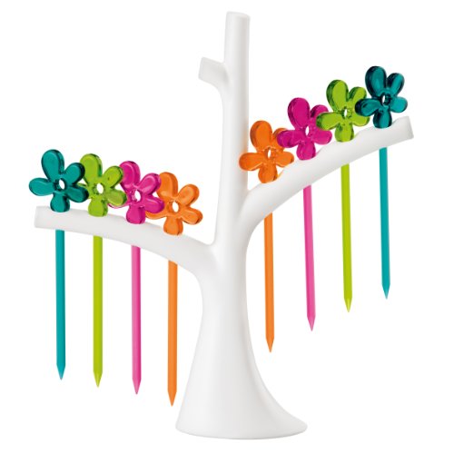 Koziol- Set di forchettine da Party con Supporto ad Albero, Colore: Verde pisello/Arancio/Fucsia/Azzurro