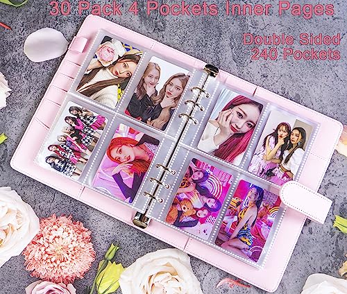 A5 Kpop Photocard Holder Book with 30 Pack 4 Pocket Refill Pages, A5 6 Ring Binder 2.5x3.5 Photo Collector and Sleeves (Rosa)