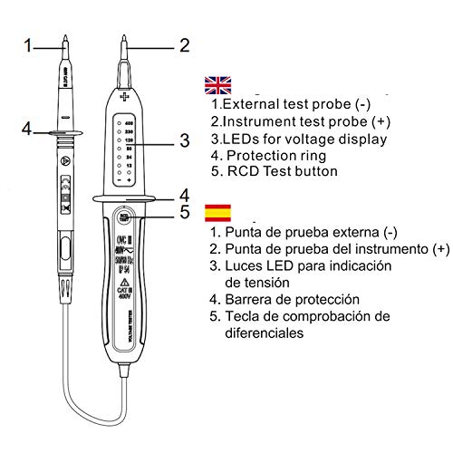 KPS-DT220 Rilevatore di tensione e test dei differenziali RCD (Residual Current Device), tensione 12V-400V, polarità, e indicatore LED, Protezione IP54