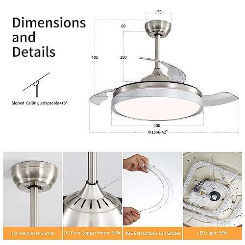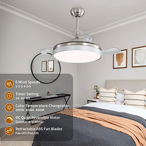 KPUY Ventilatore da soffitto con luce e telecomando, ventilatore a pale invisibili in ABS, luce a LED dimmerabile a 3 colori, motore silenzioso reversibile a 6 velocità DC