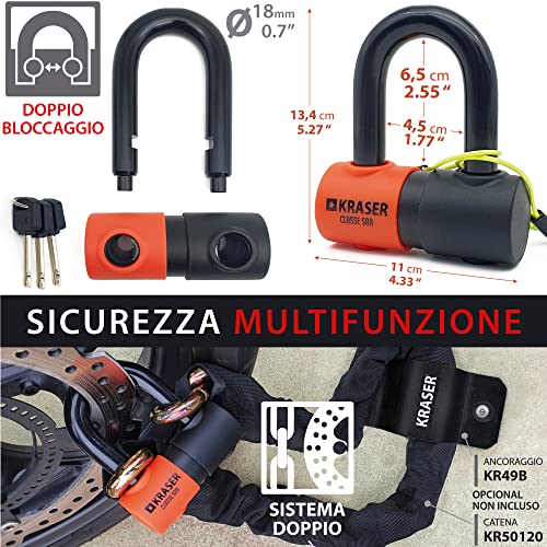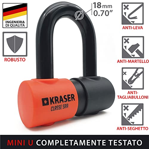 KRASER KR50 Bloccadisco Moto Omologato SRA, Mini U Solid Ø18, 3 Chiavi Alta Sicurezza Reminder Cavetto, Antifurto Moto, Lucchetto Moto Scooter Multiuso
