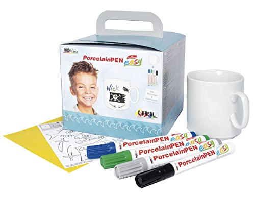 Kreul 16361-Set di Tazze PorcelainPen Easy per Ragazzi, Tazza Bianca, 3 Penne in Porcellana Pennello nei Colori Blu, Verde e Grigio, Penna con Punta fine per contorni, Multicolor, One size