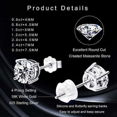 KRFY Orecchini Moissanite 1ct/2ct Brillante Taglio Rotondo D Colore VVS1 Orecchini con Diamanti Creati 18K Placcato Oro Bianco Orecchini Moissanite in Argento con Parte Posteriore in Silicone 4-8MM