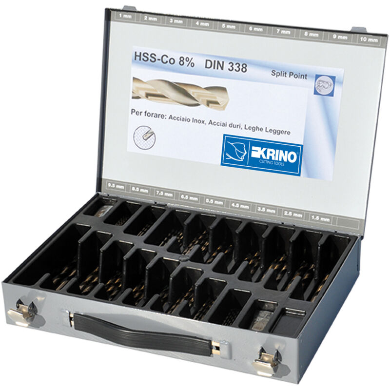 In valigetta. Misure: 1 (pz.10) - 1,5 (pz.10) - 2 (pz.10) - 2,5 (pz.10) - 3 (pz.10) - 3,5 (pz.10) - 4 (pz.10) - 4,5 (pz.10) - 5 (pz.10) - 5,5 (pz.3) - 6 (pz.3) - 6,5 (pz.3) - 7 (pz.3) -7,5 (pz.3) - 8 (pz.3) - 8,5 (pz.2) - 9 (pz.2) - 9,5 (pz.2) - 10 (pz.2). Per acciaio inox.