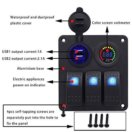 Kriogor 3 Gang Impermeabile Interruttore a Levetta Pannello ON-off Rocker Switch Pannello + LED Voltmetro 12V + 4.2A Dual USB Presa Caricabatterie per Auto Camper Barca