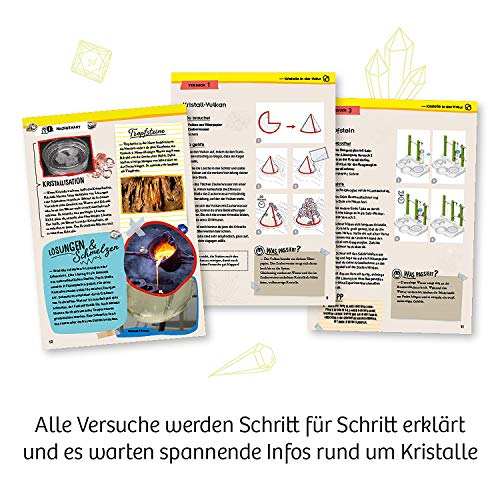 Il libretto di istruzioni a colori guida in modo chiaro e graduale attraverso gli esperimenti e tiene a disposizione emozionanti informazioni di sfondo intorno ai cristalli e alla loro versatilità