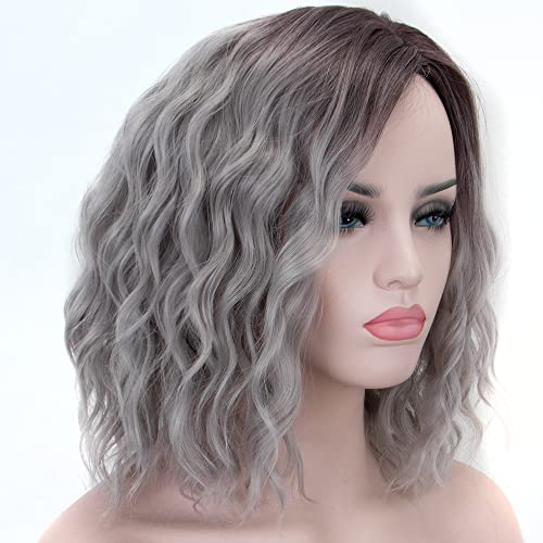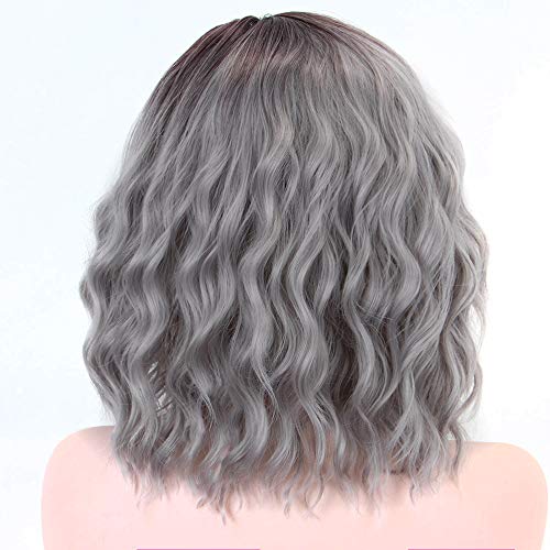 Informazioni di base della parrucca: parrucca corta Bob con radici scure parrucca sintetica ondulata grigia (promemoria gentile: leggermente differenza di colore tra i diversi monitor)