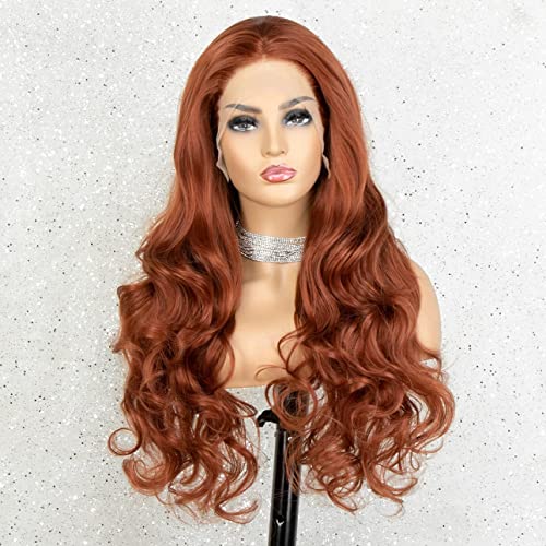 Kryssma Parrucca anteriore in pizzo rosso rame con parte libera parrucche sintetiche ondulate lunghe per le donne # 350 resistente al calore