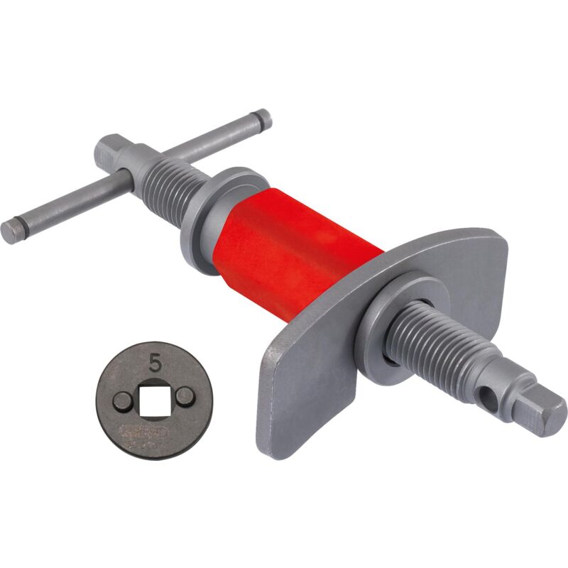 Grazie alla riconfigurazione con filettatura a sinistra e destra A integrazione del dispositivo di pressione e di rotazione dei pistoncini dei freni Con attacco quadro universale Con piastra di ritegno Acciaio speciale per utensili