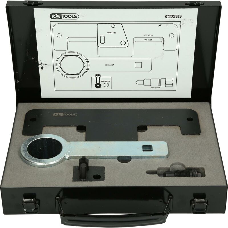 Per la riparazione professionale del motore Per la sostituzione della catena di distribuzione Elevata adattabilità In robusta cassetta metallica Campi di applicazione: Audi A8 (2002 - 2011), S8 (2001 - 2015), Q7 (2003 - 2010), A3 (2005 - 2015), TT (2011 - 2012), Porsche Cayenne (2001 - 2004), Škoda Superb 2 (2010 - 2016), Volkswagen Phaeton (2007 - 2015), Touareg (2003 - 2012), Passat (2005 - 2014), Passat CC (2010 - 2014), Eos (2010 - 2014), Golf 4 (2001 - 2004), Golf 5 (2006 - 2009), Bora (2001 - 2004), Sharan (2000 - 2010) e T4 (2000 - 2003) con motori a benzina 2.8 l, 3.2 l, 3.6 l, 4.0 l, 6.0 l e 6.3 l (codice motore: BDE / AYL / AMV / CBRA / AXZ / BDB / BMJ / BUB / M55/02 / M55/01 / CDVA / BWS / CHNA / BHK / BHL / CGRA / CMTA / BDN / BDP / BAN / BAP / BRN / BRP / BTT / BJN / CEJA / CTNA)