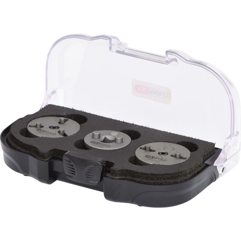 Con adattatori universali regolabile per pistoncini di frenatura unici a 2 e a 3 perni e con adattatore da 3/8“ con magneti Ideale per un ripristino senza danni del pistoncino del freno Nessun danno a cuffie, pistoni e relativi fori sulle pinze dei freni Necessario per interventi di manutenzione e per la sostituzione del ceppo freni, per comprimere nuovamente il pistoncino freni nella pinza freni Combinabile con il tradizionale Utensile di ripristino dei pistoncini freni In robusta valigetta di plastica