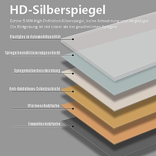 Infrangibile e resistente alla corrosione: non preoccuparti della frantumazione del vetro dello specchio e dei problemi correlati. Questo specchio LED è realizzato in specchio argentato ad alta definizione da 5 mm, noto come vetro antiproiettile. Non facile da rompere. Anche se si rompe, non si romperà, non causerà alcun danno ed è più sicuro da usare. Questo specchio è rivestito con resina epossidica per prevenire la corrosione.