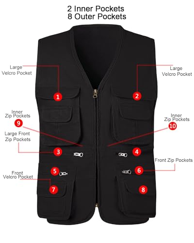 MULTI-TASCHE: gilet da pesca con 10 tasche di varie dimensioni, comprese tasche con cerniera di sicurezza e tasche con chiusura in velcro, è comodo per riporre telefoni cellulari, licenze, chiavi, strumenti, portafogli. Inoltre, assicurandoti che le tue mani siano libere di concentrarsi su tutto ciò in cui sei impegnato.
